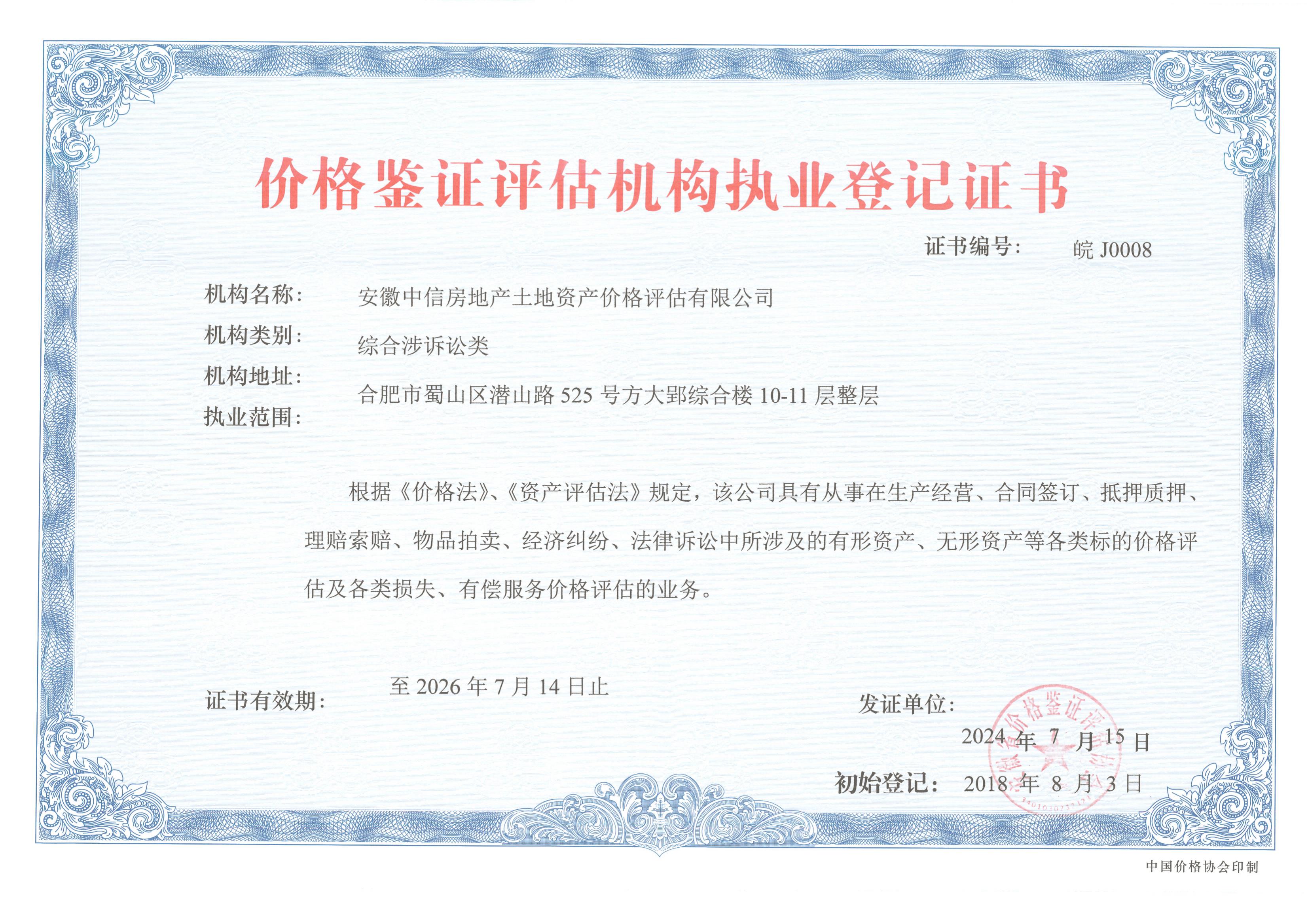 價(jià)格評(píng)估機(jī)構(gòu)執(zhí)業(yè)登記證書